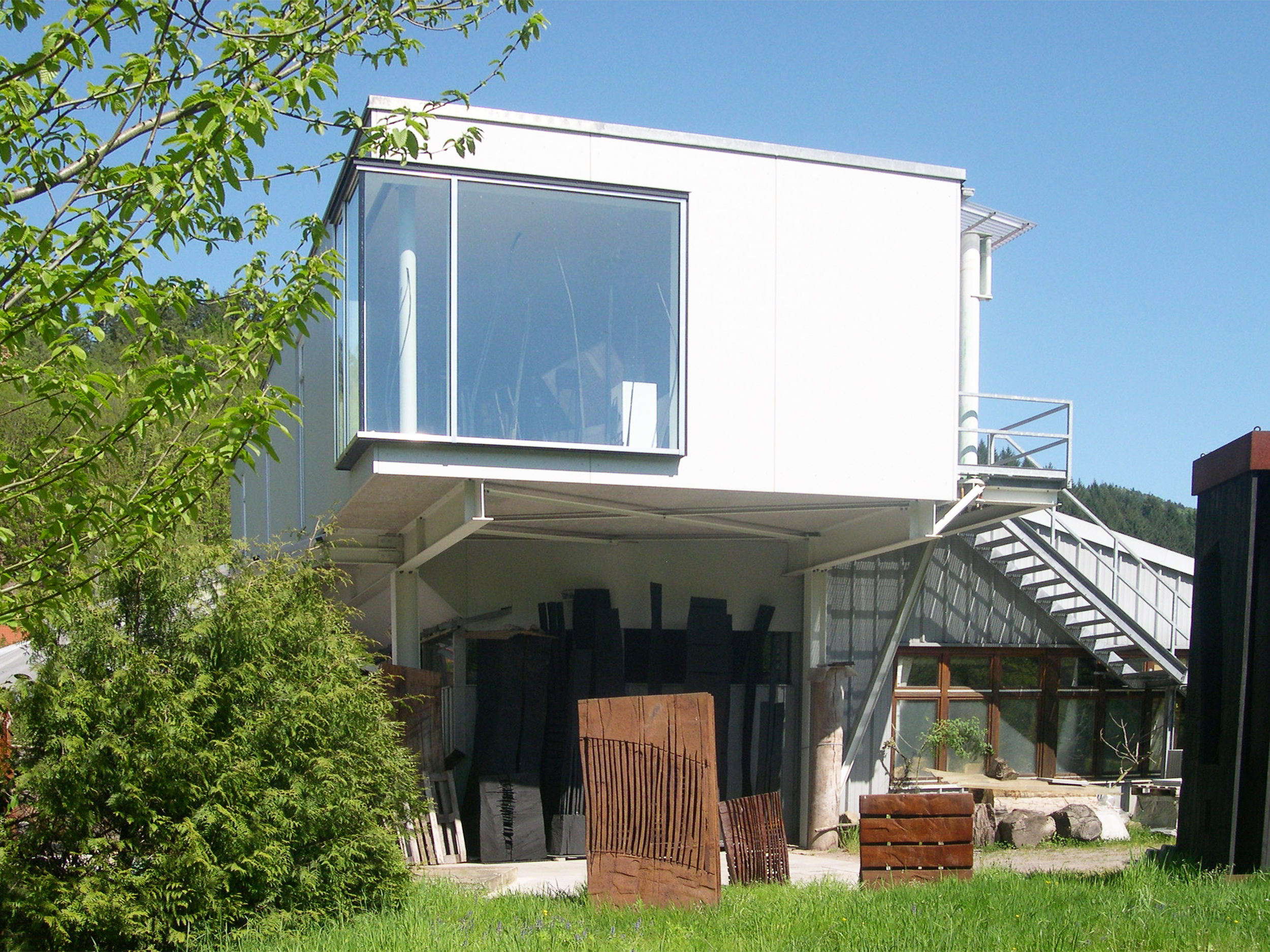 Das Atelier des Künstlers Armin Göhringer liegt in der Talsohle in Nordrach im Kinzigtal. Die Nordrach schlängelt sich hier auch am Gebäude als natürlicher Bachlauf von Ort zu Ort. Ein reicher Baumbestand prägt das Bild und seine Umgebung. Ziel war einen Ausstellungsraum zu schaffen, der den Bestand und die Arbeit des Künstlers kaum tangiert. Ein schlichter Kubus schwebt nun als Solitär über dem bestehenden Atelier. Er bietet in seiner exponierten Höhenlage fantastische Einblicke, Ausblicke und Lichtblicke. Ein stimmungsvoller Ort zur Bereitstellung und Ausstellung der Exponate.