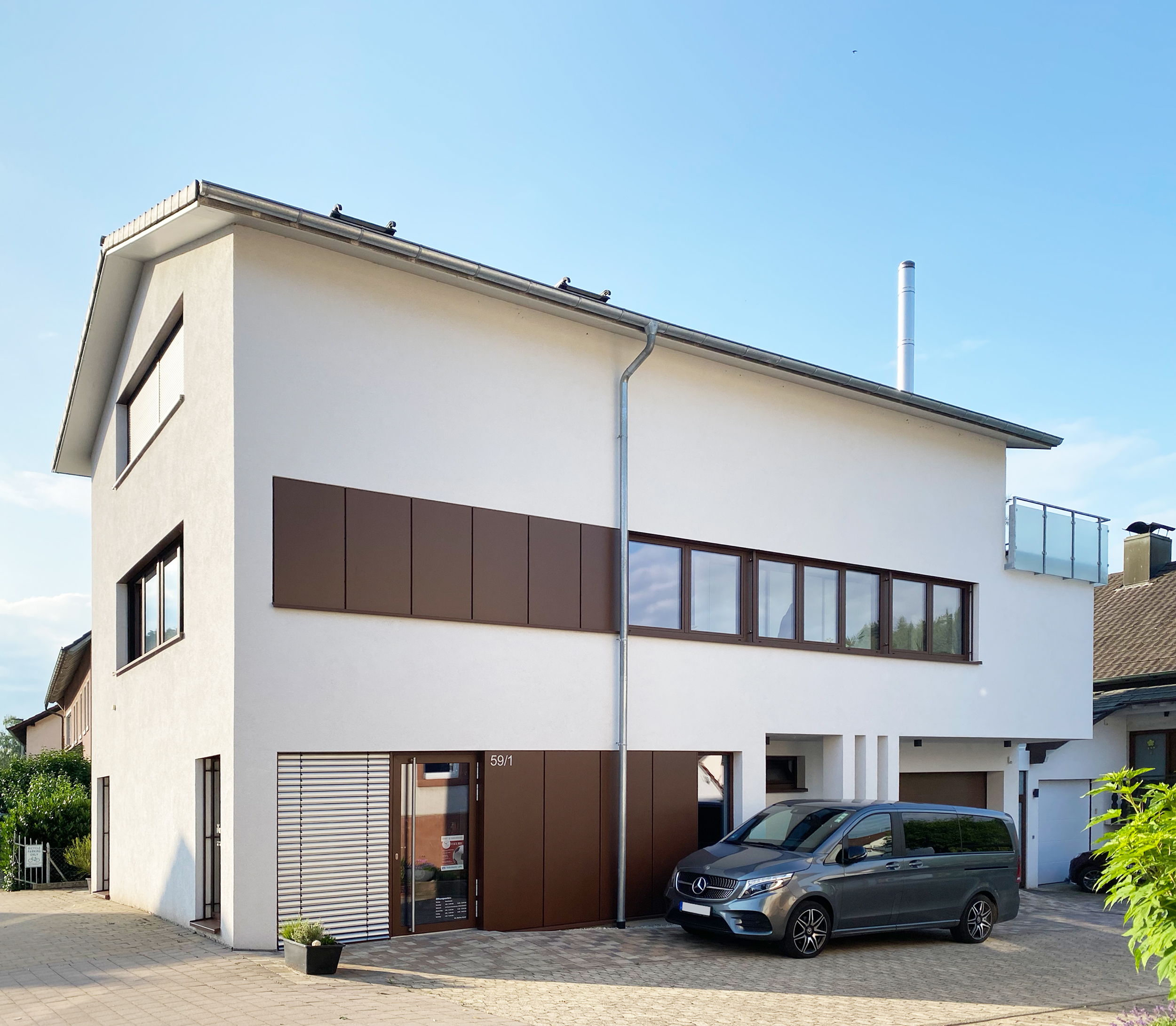 In zentraler Ortslage liegt dieses Einfamilienwohnhaus mit integriertem Friseursalon, welcher sich mit raumhohen Verglasungen im Erdgeschoss in Richtung Straße öffnet. Über die Hofzufahrt werden Garage und Eingangsbereich des Wohnhauses erschlossen. Technikräume befinden sich im rückwärtigen Bereich des Erdgeschosses. Eine einläufige Treppe führt vom Erdgeschoss über das Obergeschoss mit dem großzügigen Bad, den Schlafräumen, einer Ankleide und eines Büros ins offene, lichtdurchflutete Dachgeschoss. Hier befindet sich die Küche mit dem Ess- und Wohnbereich, die sich in Richtung Terrasse mit Ausblick ausrichtet. Abgetrennt sind hier lediglich WC und Abstellraum. Der rechteckige, längliche Baukörper wurde mit verputztem Mauerwerk erstellt. Die optische Fensterbandabsetzung wurde mit Fassadentafeln ergänzt.