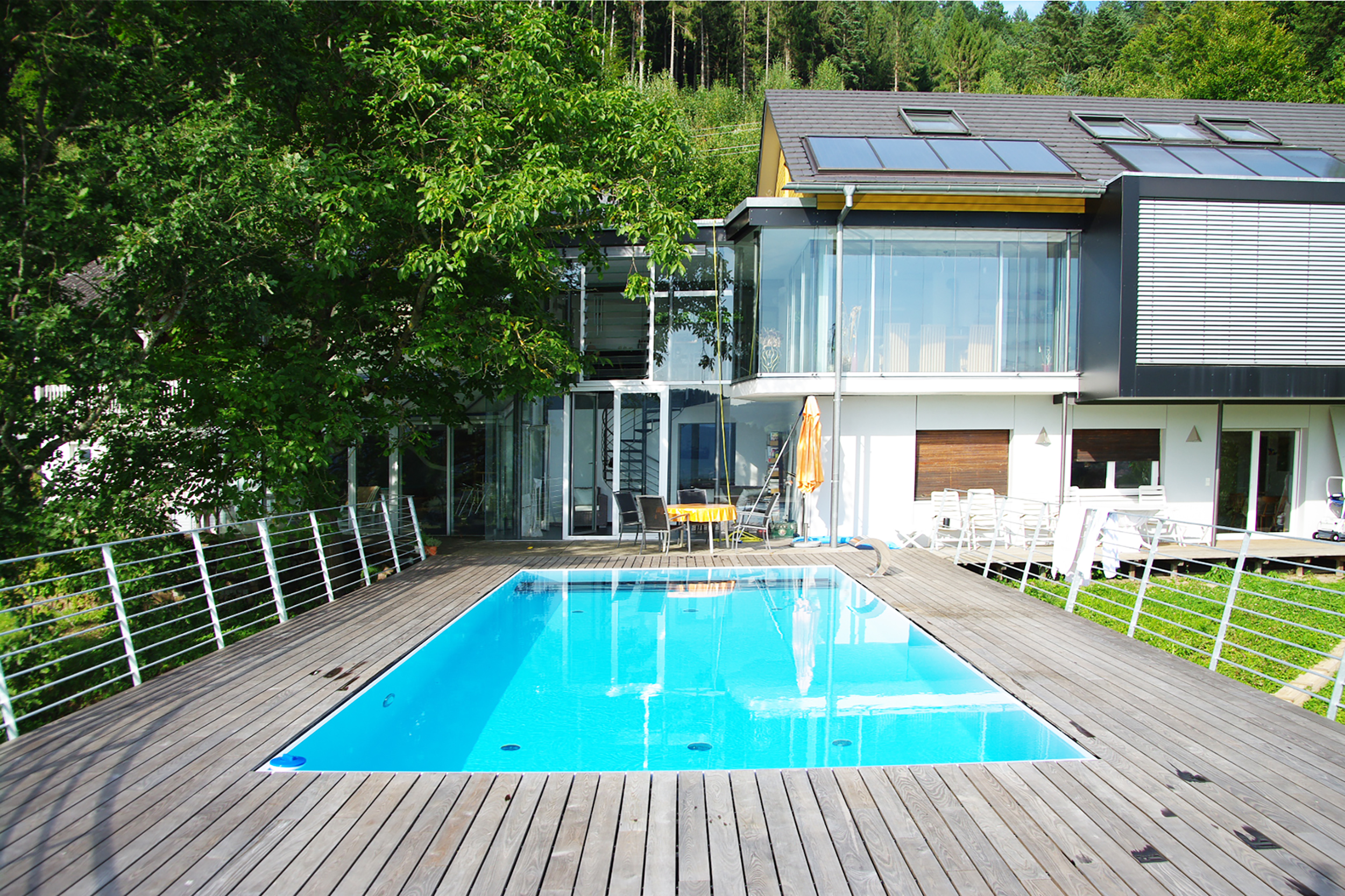 Für In steiler Hanglage am Forst von Biberach/Baden konnten wir Architektur skulptural verwirklichen. Hier versteht sich Architektur als Bauen von raumbestimmenden Gebilden. An die steilabfallende Westseite des bestehenden Wohnhauses hat ein Schiff seine Anlegestelle gefunden. Das Deck aus Holzdielen integriert auch einen Pool. Die offene schräg gestellte Reling verläuft um das Deck und trifft sich vorne an der Bugspitze, betont durch einen Mast. Der Ausblick an dieser Stelle erlaubt die Sicht in die Weite des Kinzigtals. Die Stahlprofile der Tragkonstruktion sind im Schiffsrumpf verborgen und beinhaltet den Pool mit seiner Technik.